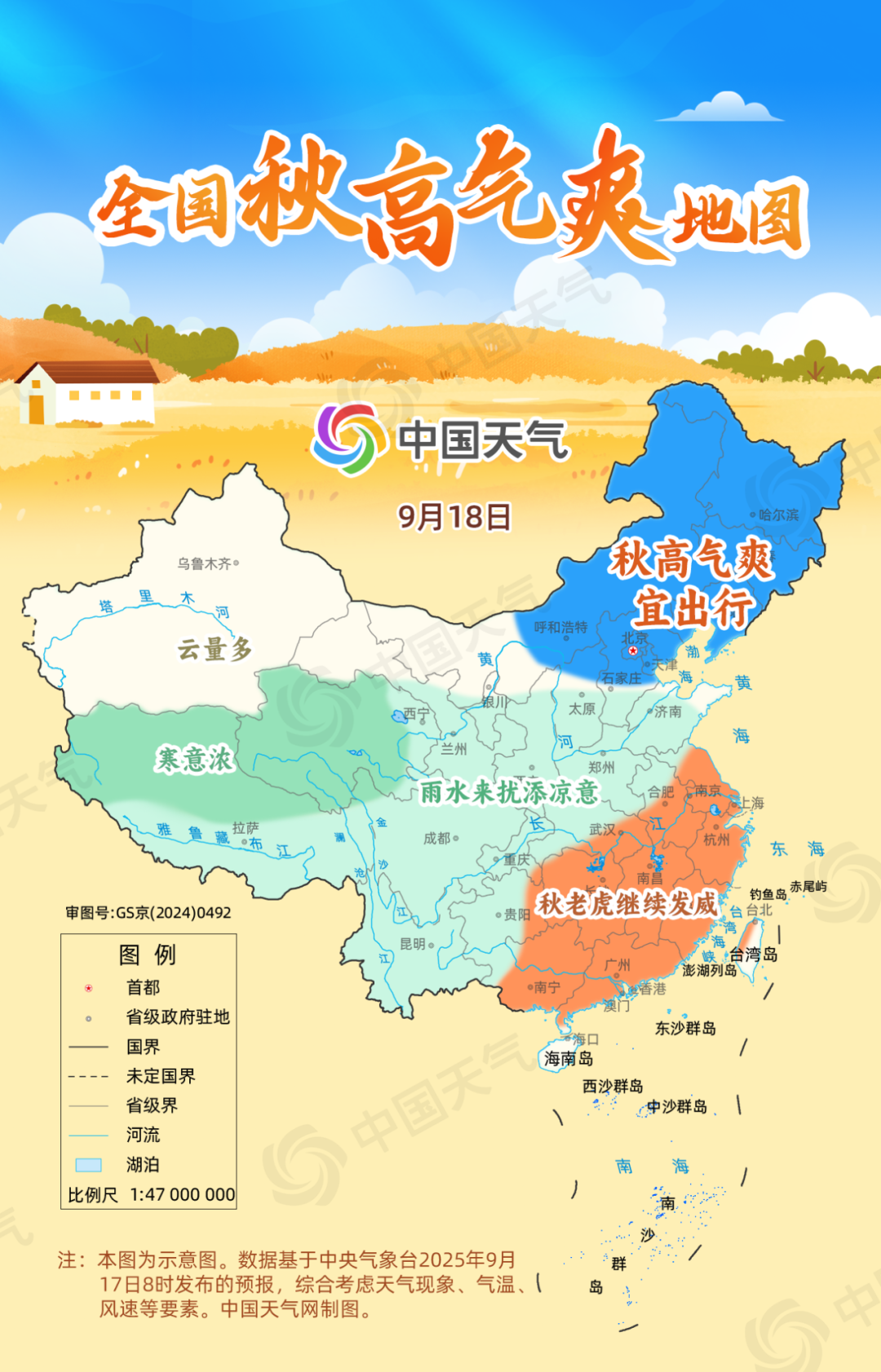 18日,秋高氣爽的范圍將縮小,吉林、遼寧、內(nèi)蒙古東部、華北北部等地秋高氣爽宜出行。黃淮多地雨水將增強(qiáng),陜西、黃淮大部雨水來擾添涼意,多地最高氣溫將降至20℃以下,天氣有些涼了。