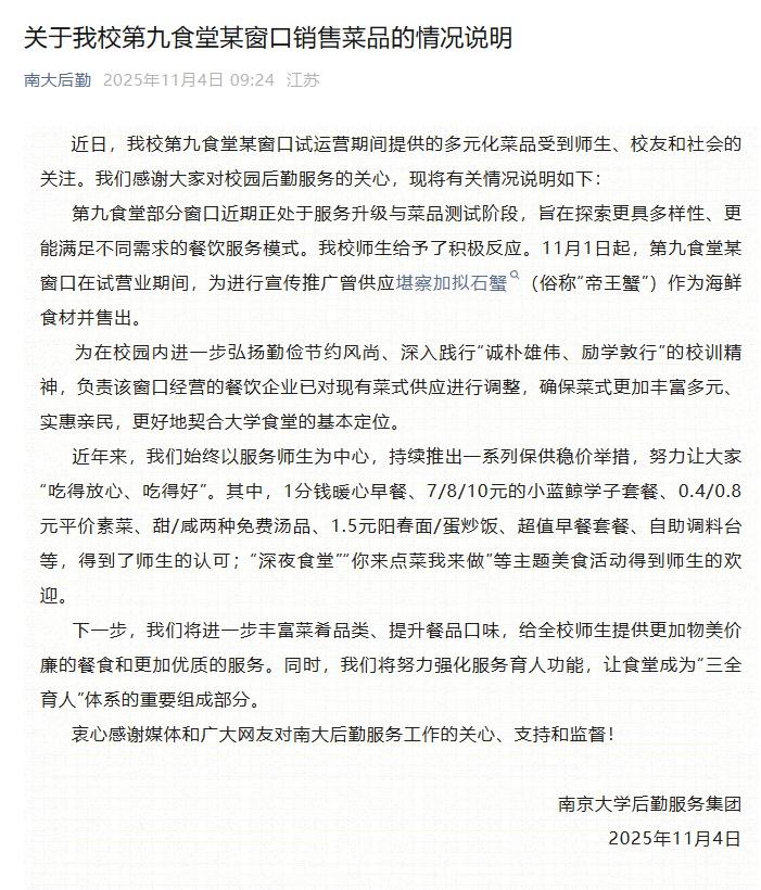 11月4日,南京大學(xué)發(fā)布情況說明:餐飲企業(yè)已對(duì)現(xiàn)有菜式供應(yīng)進(jìn)行調(diào)整,具體如下: