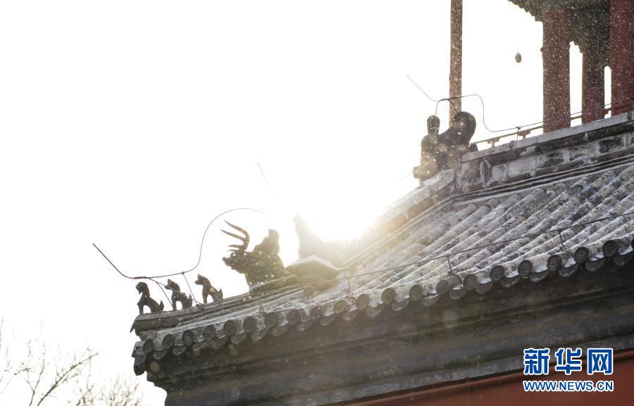 當(dāng)日,受低層偏東風(fēng)增濕和地形抬升的共同作用,北京出現(xiàn)降雪天氣。在北京市東城區(qū),鐘鼓樓籠罩在彌散的雪花中,盡顯古都冬韻。
