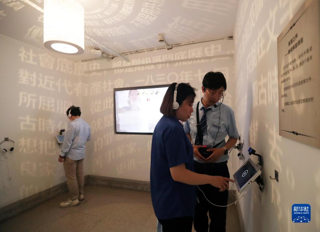 6月9日,在又新印刷所舊址內(nèi),參觀者通過智能屏互動(dòng)朗讀《共產(chǎn)黨宣言》。