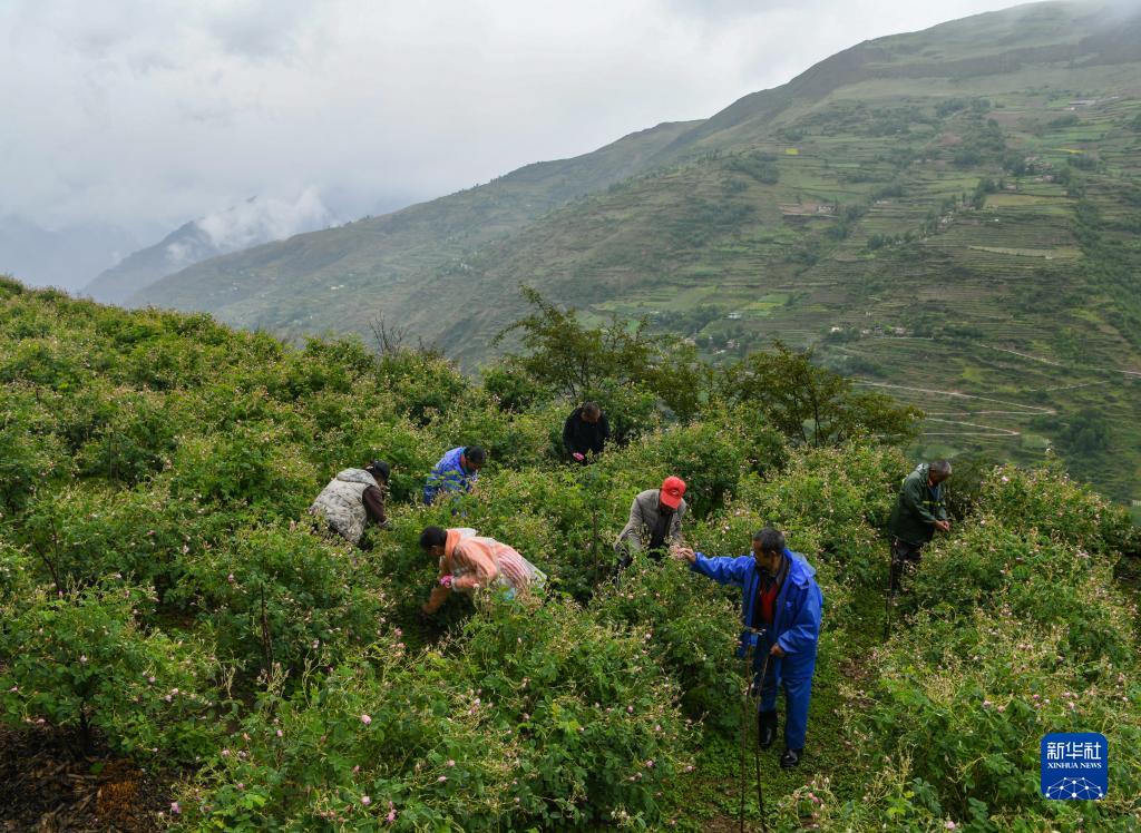 6月14日,在四川省阿壩州小金縣新橋鄉(xiāng)共和村,當(dāng)?shù)胤N植戶在采摘玫瑰鮮花。