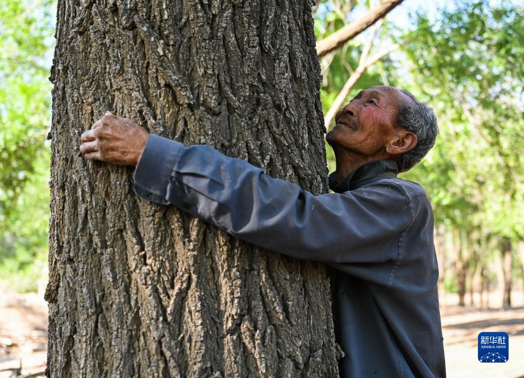 6月14日,曹扎娃撫摸一棵他親手種下的榆樹。