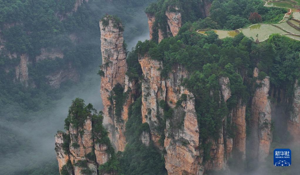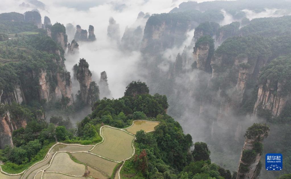 近日,湖南張家界迎來連續(xù)降雨。雨后,云霧在連綿聳立的峰林間飄蕩,懸崖峭壁之上的農(nóng)田在云霧中若隱若現(xiàn),構(gòu)成一幅幅獨特的生態(tài)畫卷。