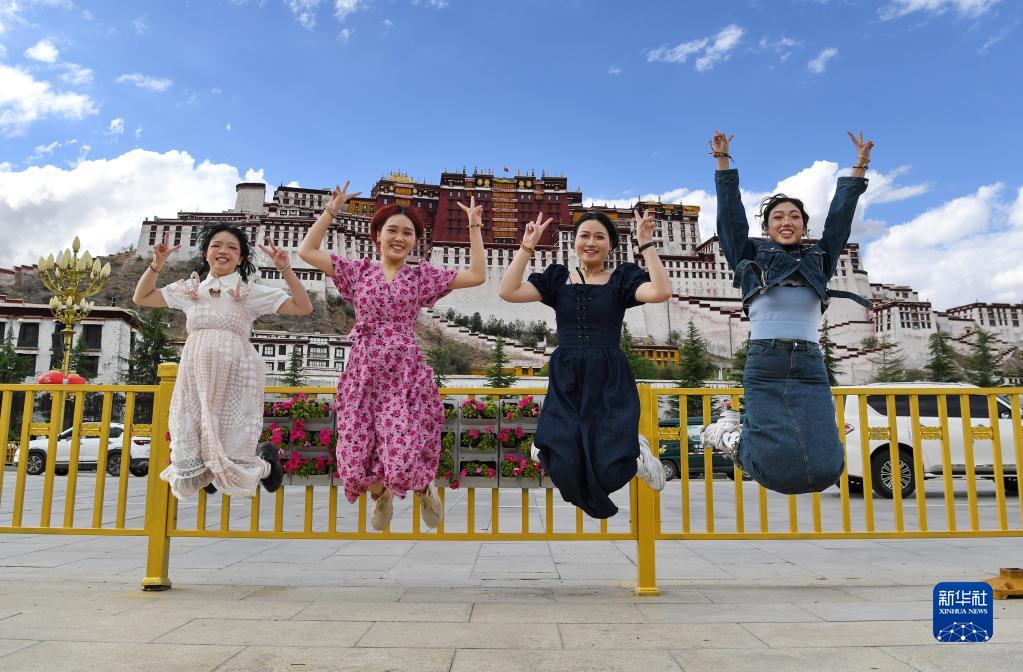 游客在布達(dá)拉宮廣場(chǎng)上合影留念(6月16日攝)。