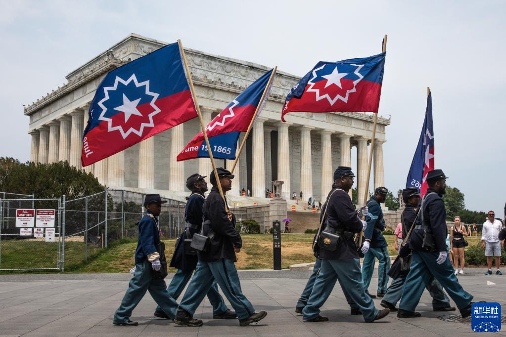 6月19日,在美國首都華盛頓的林肯紀(jì)念堂附近,人們扮演成南北戰(zhàn)爭時期的士兵,紀(jì)念黑奴解放日。
